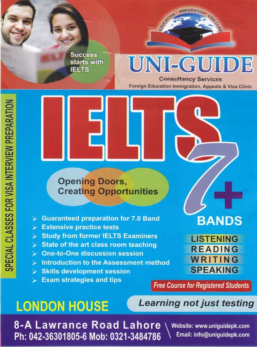 UNI-GUIDE proudly offers exclusively in-house training to students in English language tests like IELTS, TOEFL, PEARSON PTE, and general aptitude testing services such as GRE and NTS, etc.